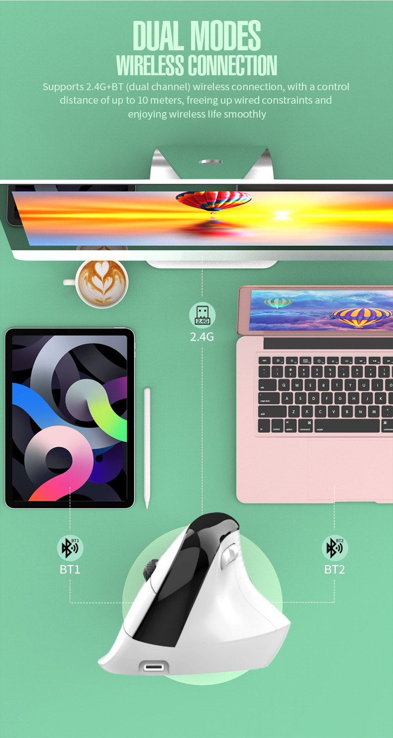 AM069 - Mouse wireless AdyMel®, design ergonomic vertical, 2.4GHz + BT 5.0, 4000 dpi, Acumulator, Alb