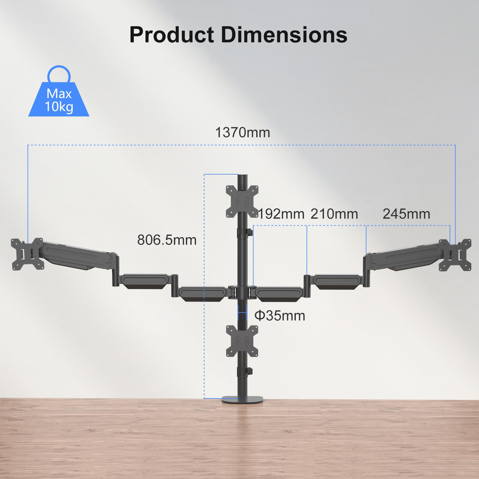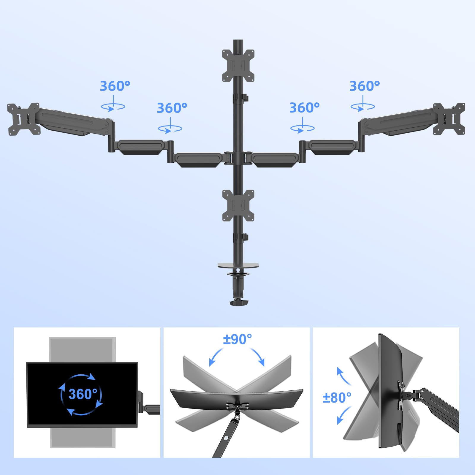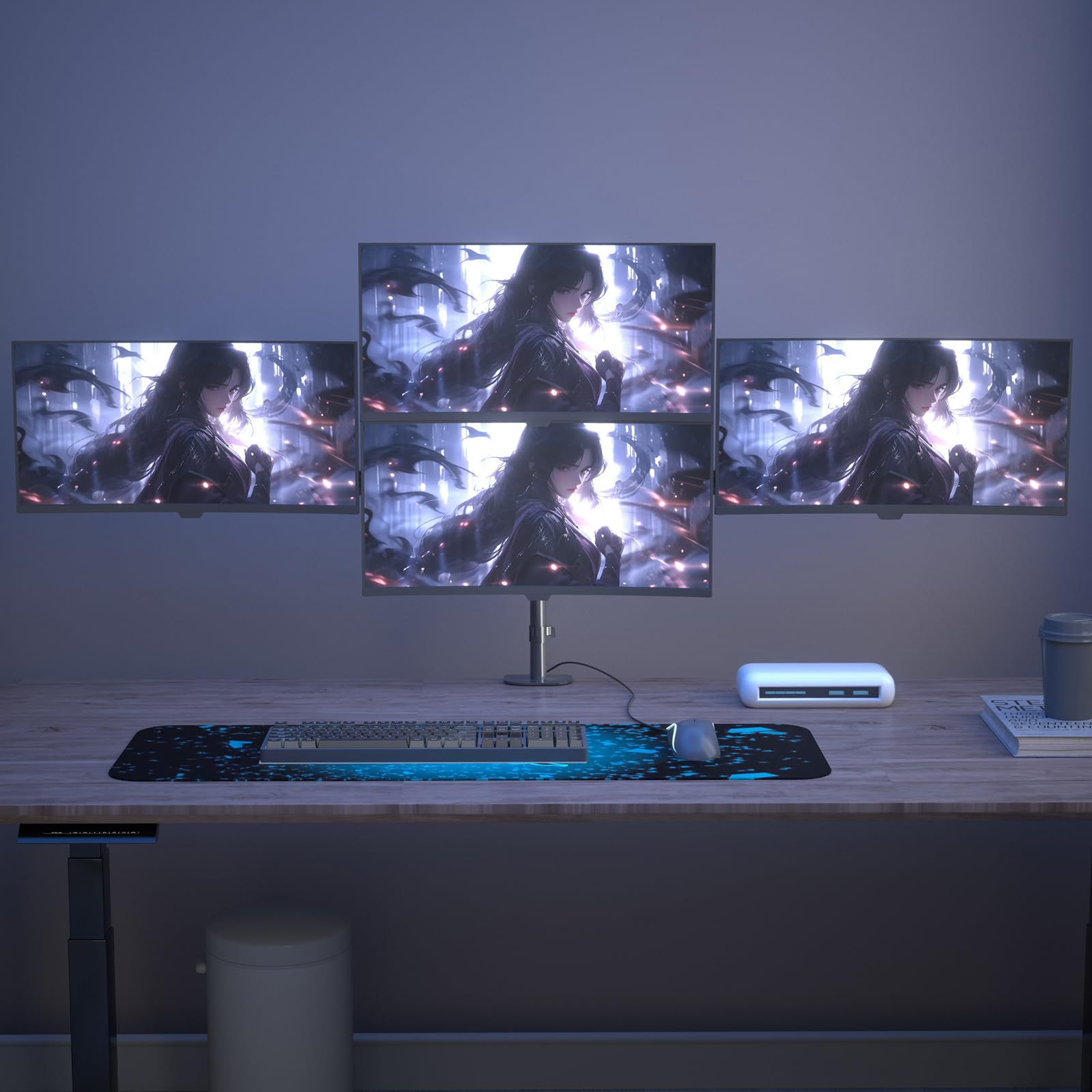 Suportul pentru 4 monitoare cu brate pe gaz este soluția ideală pentru un setup profesional, ergonomic și elegant. Compatibil cu monitoare de până la 32” și standard VESA 75x75 / 100x100, oferă ajustare pe înălțime, rotire 360° și control precis al fiecărui ecran. Designul robust din metal și sistemul integrat de cable management transformă biroul într-un spațiu organizat și modern, perfect pentru multitasking, gaming, trading sau editare.
