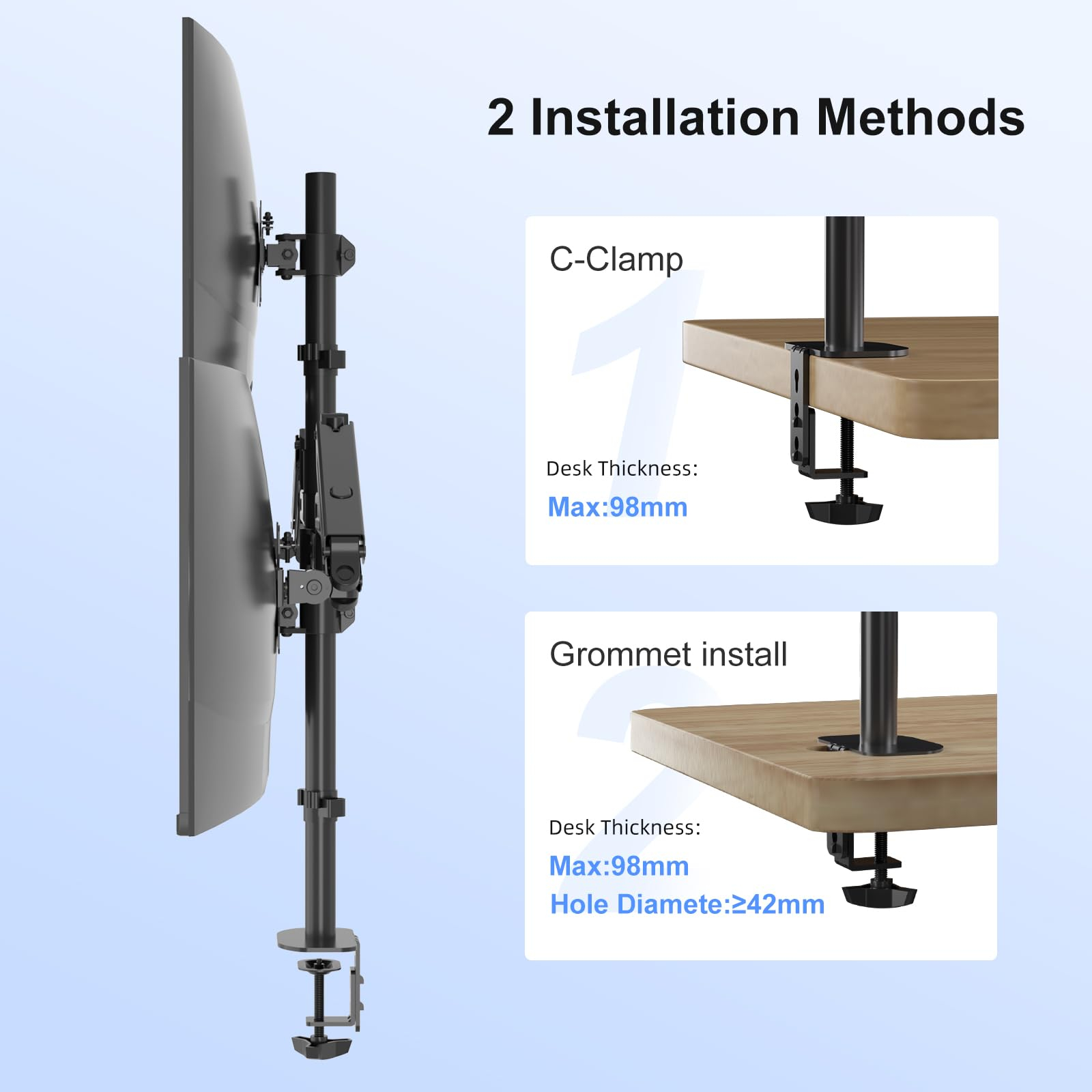 Montare dubla: clema birou sau prindere prin orificiu (grommet)