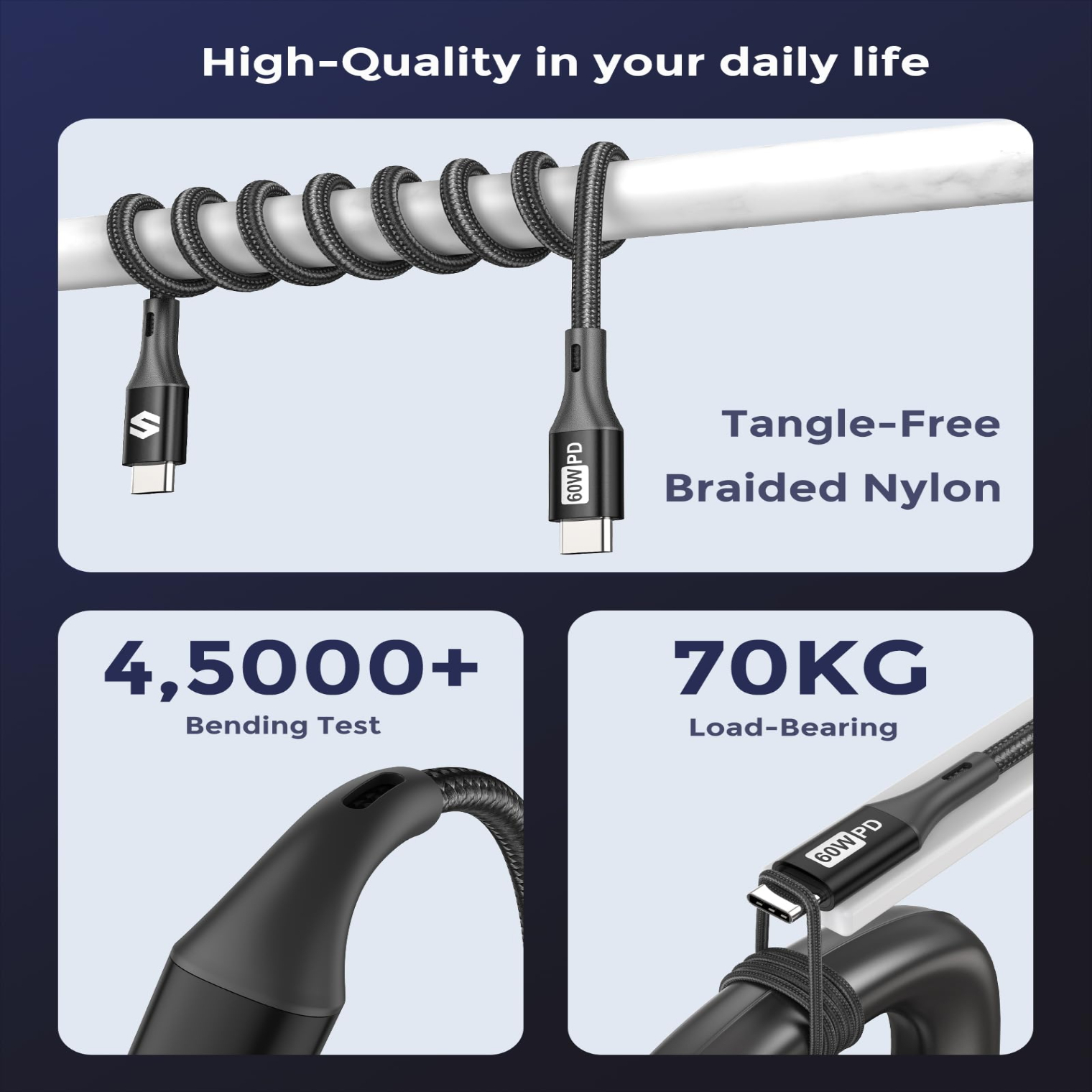 Calitate premium si rezistenta sporita – cabluri cu impletitura durabila, rezistente la indoire si utilizare zilnica intensa.