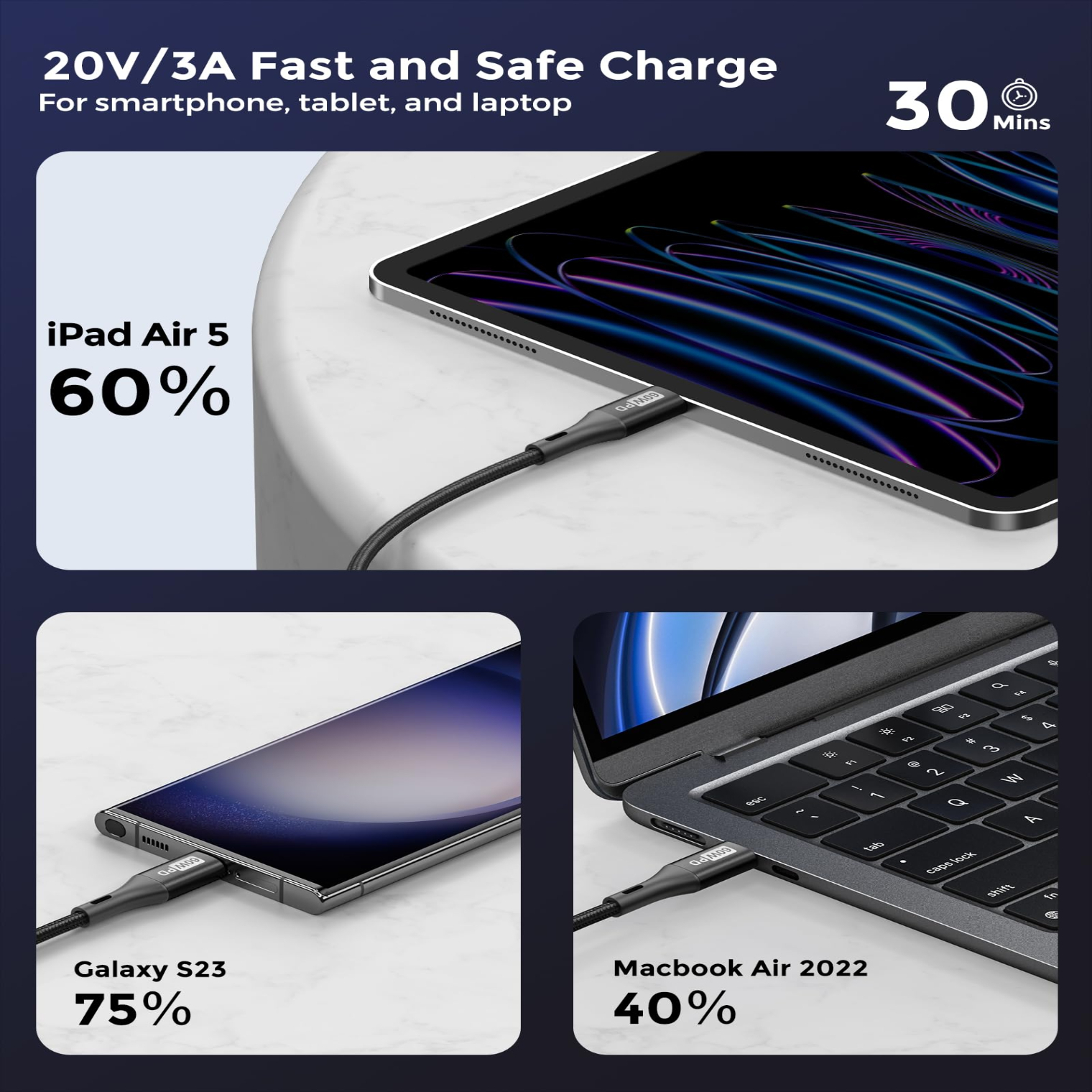 Un cablu de 60W este suficient pentru majoritatea telefoanelor si laptopurilor – nu ai nevoie de unul de 100W daca dispozitivul tau suporta doar 20W, 30W, 35W sau 40W.