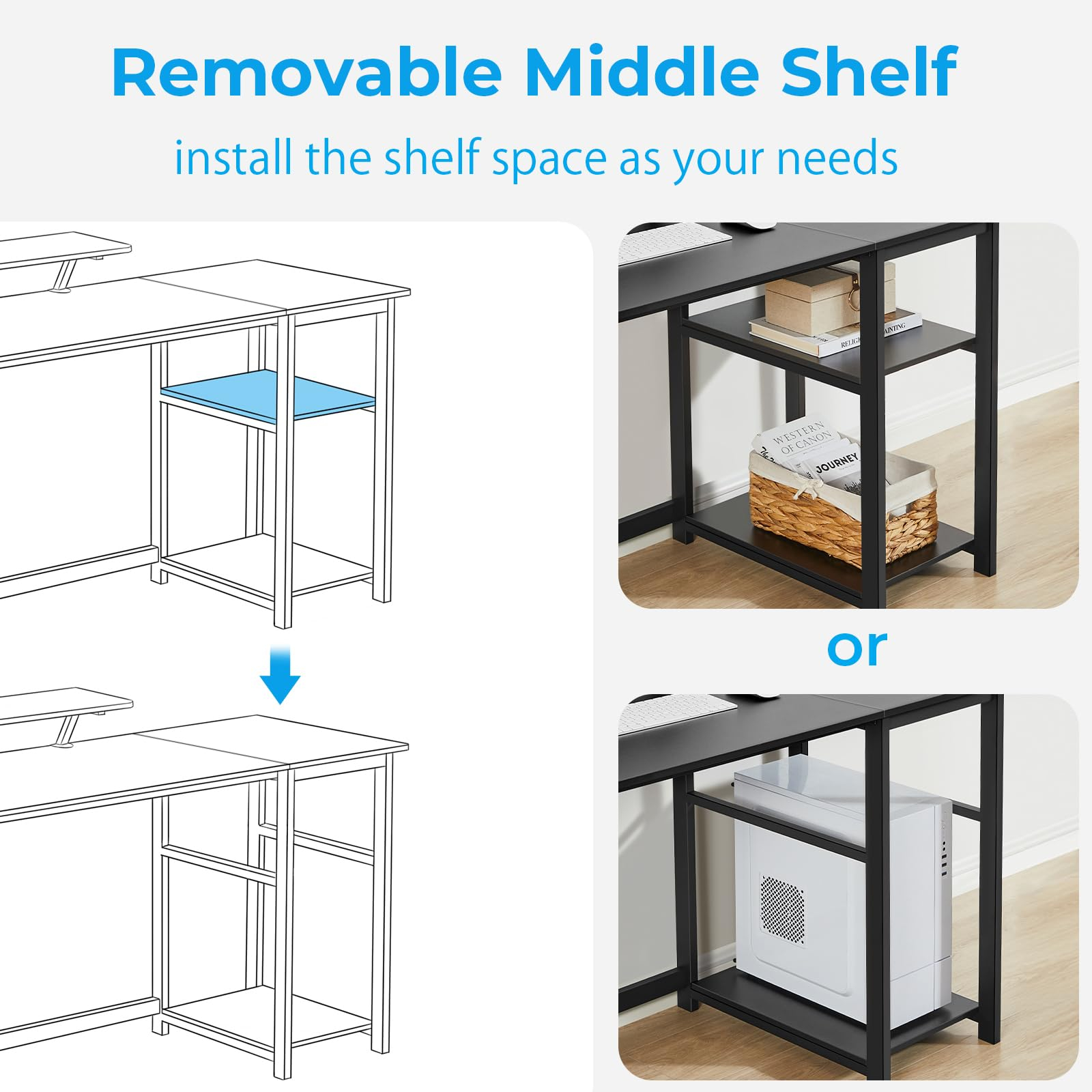 Designul inteligent include rafturi laterale detașabile, care pot fi montate în funcție de preferințe, oferind spațiu suplimentar pentru depozitarea unității PC, cărților, accesoriilor sau documentelor. Suportul pentru monitor ajută la menținerea unei poziții corecte a corpului, reducând tensiunea la nivelul gâtului și al spatelui.