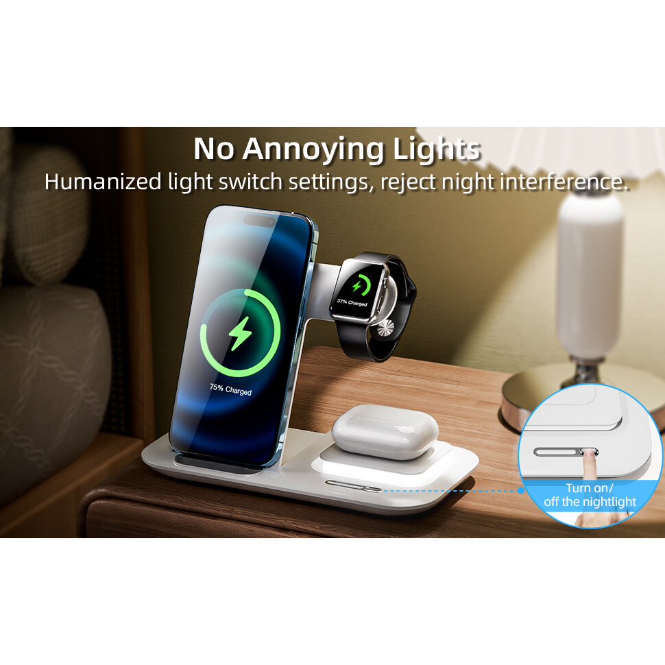 Incarcatorul wireless AdyMel® 5 in 1 este un dispozitiv multifunctional, ideal pentru utilizatorii care doresc o solutie compacta si eficienta pentru a-si incarca simultan telefoanele, castile si ceasul inteligent.