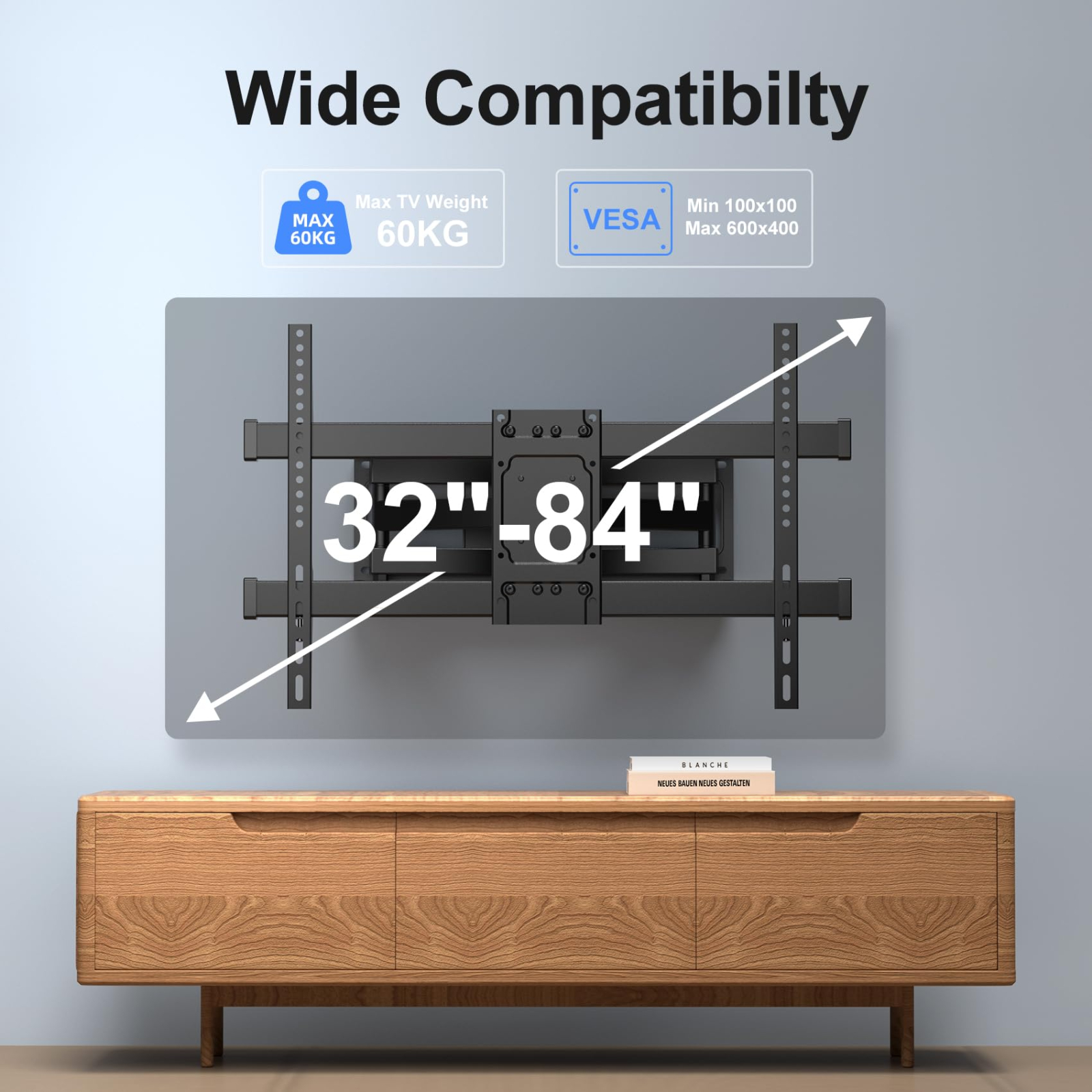 Suportul TV de perete Suptek®, complet reglabil si ultra-rezistent, este solutia perfecta pentru televizoarele moderne plate sau curbate. Compatibil cu diagonale intre 32 si 84 inch si o greutate de pana la 60 kg, acest suport universal asigura flexibilitate, stabilitate si economie de spatiu. Cu brate articulate, inclinare si rotire larga, poti obtine un unghi de vizionare perfect din orice pozitie din camera.