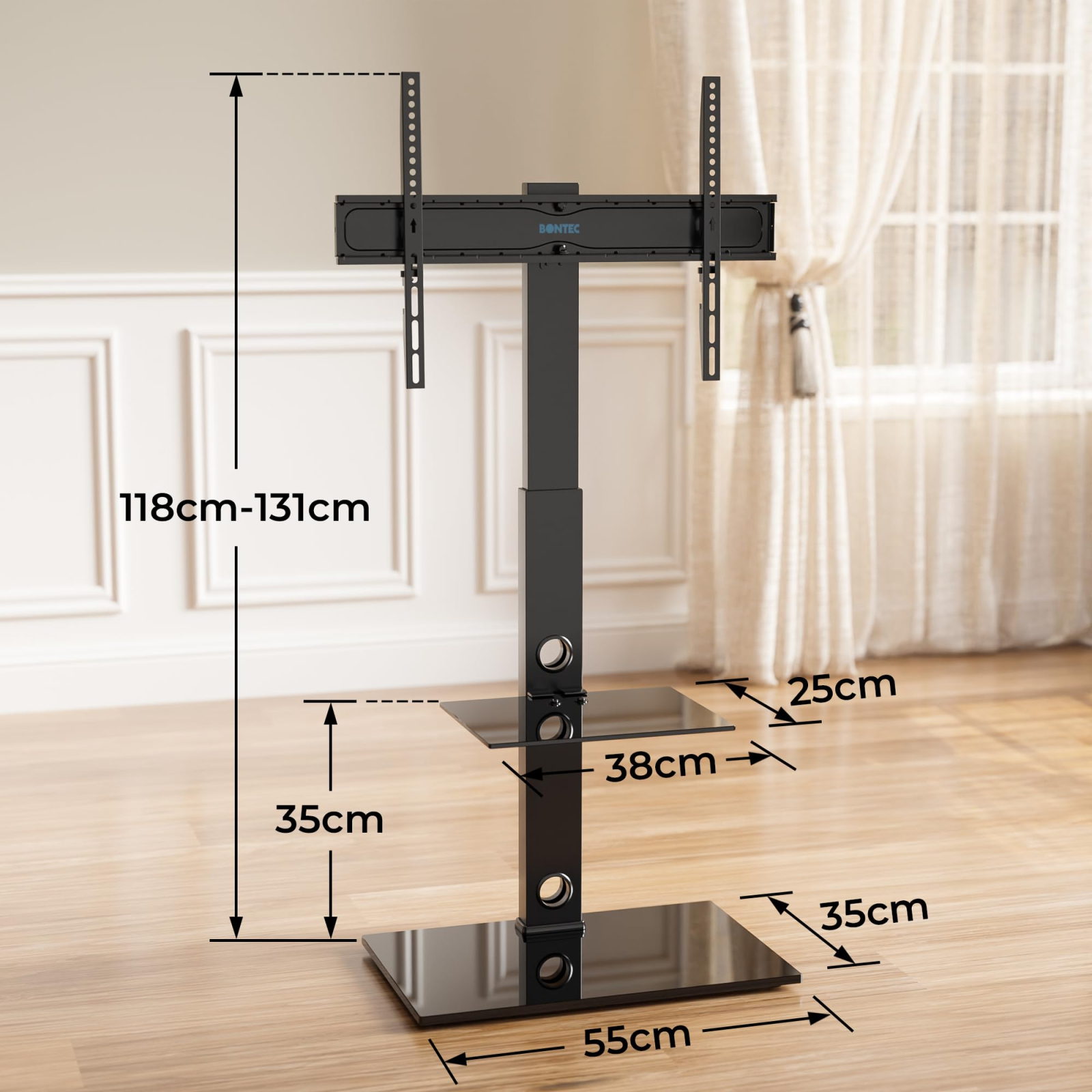 Transforma modul in care iti privesti emisiunile si filmele preferate cu suportul TV cu stand Bontec®, creat pentru televizoare plate si curbate cu diagonale intre 30 si 70 inch. Constructia solida din otel rezistent si sticla securizata ofera stabilitate, iar designul modern se potriveste perfect in living, birou sau dormitor.