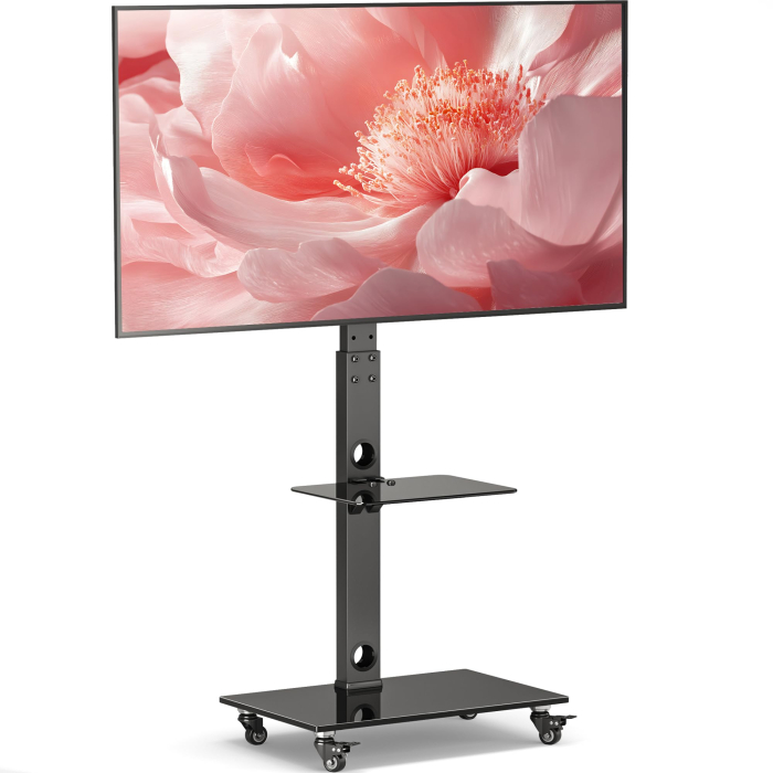 Suport TV mobil BONTEC® 30–70 inch, reglabil pe inaltime si se poate roti pana la 37° stanga/dreapta, cu roti, 2 rafturi din sticla securizata, max. 40 kg, VESA 600x400
